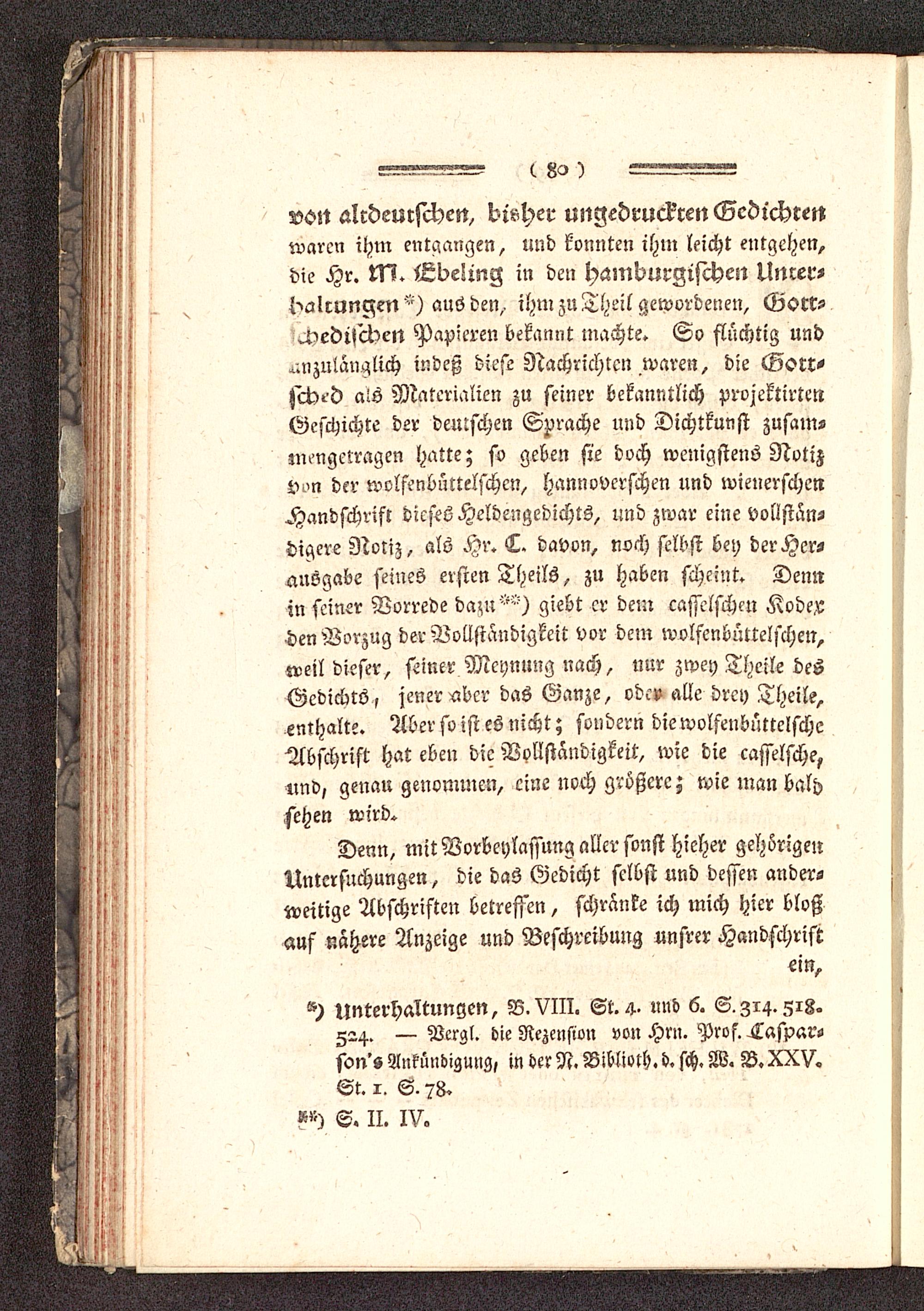 waren ihm entgangen, und konnten ihm leicht entgehen,die Hr. M. Gbe!mg in den hamburgisthen Uttrer-l>aIrunAen' ) aus den, ihm zu Theil gewordenen, Gorr-^vediscben Papieren bekannt machte. So flüchtig undunzulänglich indeß diese Nachrichten waren, die Gott -jcb^d a!s Materialien zu seiner bekanntlich projektirtenGeschichte der deutschen Sprache und Dichtkunst zusam-zm'ngttragen hatte; so geben sie doch wenigstens Notizvon der wolftnbüttelschen, hannoverschen und wienerschenHandschrift dieses Heldengedichts, und zwar eine vollstän-digere Notiz, als Hr. C. davon, noch selbst bey der Her-ausgabc seines ersten Theils, zu haben scheint. Dennin seiner Vorrede dam^) giebt er dem casselschcn Kode.vden Borzug der Vollständigkeit vor dem wolftnbüttelschen,weil dieser, seiner Meynung nach, nur zwey Theile desGcdickts, jener aber das Ganze, oder- alle drey Theile,enthalte. Aber so ist es nicht; sondern die wolfenbüttclscheAbschrift hat eben die Vollständigkeit, wie die casselsche,und, genau genommen, eine noch größere; wie man baldsehen wird.