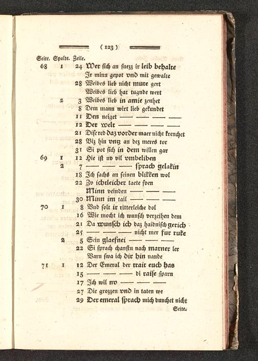 Seite. Spalte. Zeile.Hz i 24 Wer sich an snezz ir leib behalteZr minn gepot vnd mit gewalte28 Weibes lieb nicht MUte gertWeibes lieb hat tugnde wert2. Z Weibes lieb in amie zeuhet8 Dem mann wirt lieb gekündet