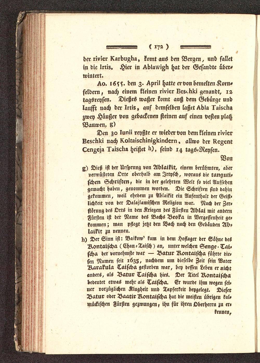 d) Der Sinn ist: Baikow' kam in dem Hoflagcr der Söhne des'Rontatscha ( Chan - Taisch) an, unter welchen Senge - Tat-sch« der vornehmste war — Batur Rontaischa führte die-sen Namen seit 1635, nachdem um dieselbe Zeit sein VaterRarakula Taischa gestorben war, bey dessen Leben er nichtanders, als Batur Taischa hies. Der Titel Rontaischabedeutet etwas mehr als Taisch«. Er wurde ihm wegen sei-ner vorzüglichen Klugheit und Tapferkeit beygelegt. DieserBatur oder Baarir Rontaischa hat die meisten übrigen kal-mückischen Fürsten gezwungen, ihn für ihren Oberherrn zu er»