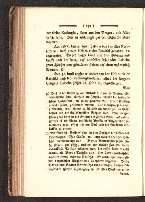 x) Dieß ist der Ursprung von Ablaikit, einem berühmten, aberverwüsteten Orte oberhalb am Jrtysch, woraus die tanguti-schen Schriften, die in der gelehrten Welt so viel Aufsehengemacht haben, genommen worden. Die Schriften sind dahingekommen, weil ehedem zu Ablaikit ein Aufenthalt der Geist«lichkeit von der Dalajlamischen Religion war. Nach der Zer-störung des Orts in den Kriegen des Fürsten Ablai mit andernFürsten ist der Name des Bachs Best« in Vergessenheit ge-kommen ; man pflegt jetzt den Zyach nach den Gebäuden Ab-laikit zu nennen.
