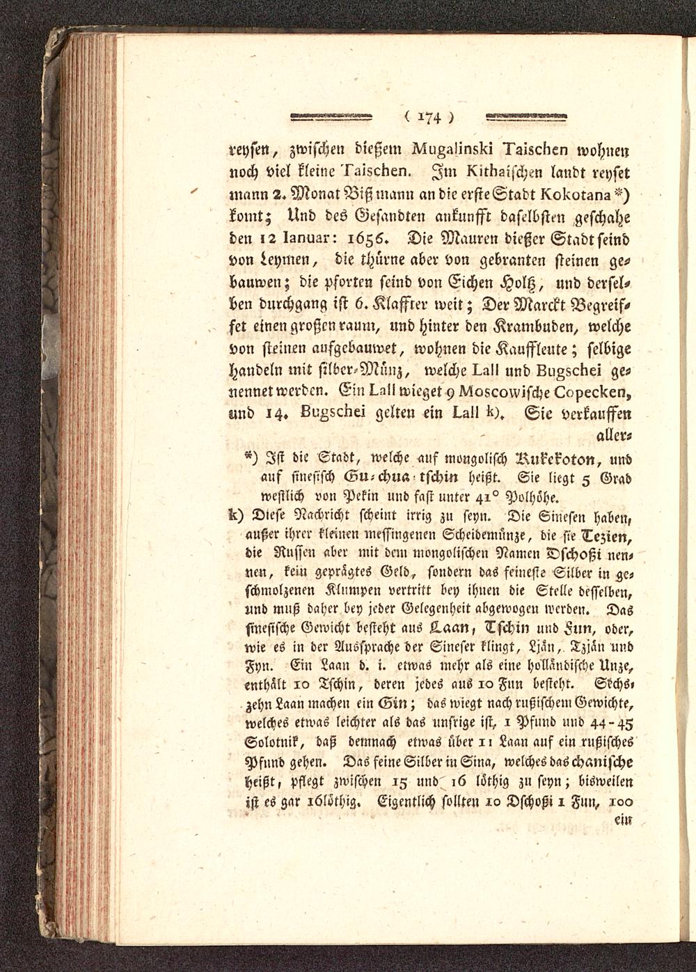 reysen, zwischen dießem ^u^ünüki l'ziscken wohne»noch viel kleine 'I'aiscnen. Im XitNüischcn landt reysetmann 2. Monat Biß mann an die erste Stadt KoKorsna -)komt; Und des Gesandten ankunfft daselbst, n geschaheden 12 Ignuar: 1656. Die Mauren dießer Stadtseindvon Leymen, die thürne aber von gebranten steinen ge-bauwen; die Pforten seind von Eichen Holtz, und dersel-ben durchgang ist 6. Klaffrer weit; Der Marckt Begreif-fet einen großen räum, und hinter den Krambuden, welchevon steinen aufgcbauwet, wohnen die Kauffleute; selbigehandeln mit silbcr^Mnnz, welche Lall und Lugscnei ge-uennetwerden. Ein wieget y ^ioscon-ische LcpecKen,und 14. L^L^Kei gelten ein I-sII i!). Sie verkauffen