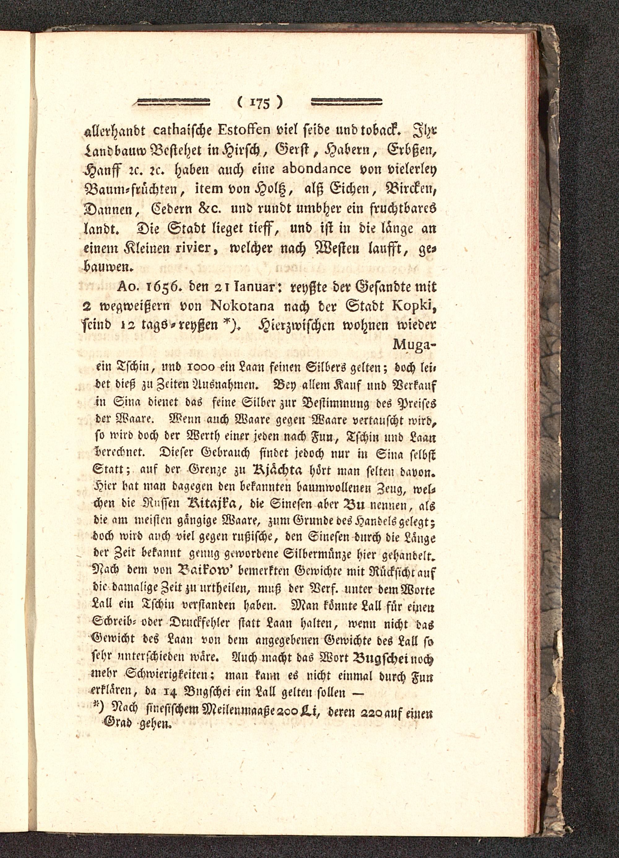 ein Tschin, und laoo ein Laan feinen Silbers gelten; doch lei>Her dieß zu Anten Ausnahmen. Bey allem Kauf und Verkaufin Sina dienet das feine Silber zur Bestimmung des Preisesder Waare. Wenn auch Waare gegen Waare vertauscht wird,so wird doch der Werth einer jeden nach Fuu, Tschin und Laanberechnet. Dieser Gebrauch findet jedoch nur in Sina selbstStatt; auf der Grenze zu Rjächta hört man selten davon.Hier bat man dagegen den bekannten baumwollenen Zeug, wel-chen die N>.ssen Ritajka, die Sinesen aber Bu nennen, alsdie am meisten gangige Waare, zum Grunde des Handels gelegt;dock wird auch viel gegen rußische, den Sinesen durch die Langeder Zeit bekannt genug gewordene Silbermünze hier gehandelt.Nack dem von ^aikow' bemerkten Gewichte mit Rücksicht aufdie damalige Zeit zu urtheilen, muß der Verf. unter demWorteLall ein Tschin verstanden haben. Man könnte Lall für chienSckreib-oder Druckfehler statt Laan halten, wenn nicht dasGewicht des Laan von dem angegebenen Gewichte des Lall sosehr unterschieden wäre. Auch macht das Wort Bugscheinochmebr Schwierigkeiten: man kann es nicht einmal durch Funerklären, da 14 Bugschei ein Lall gelten sollen —
