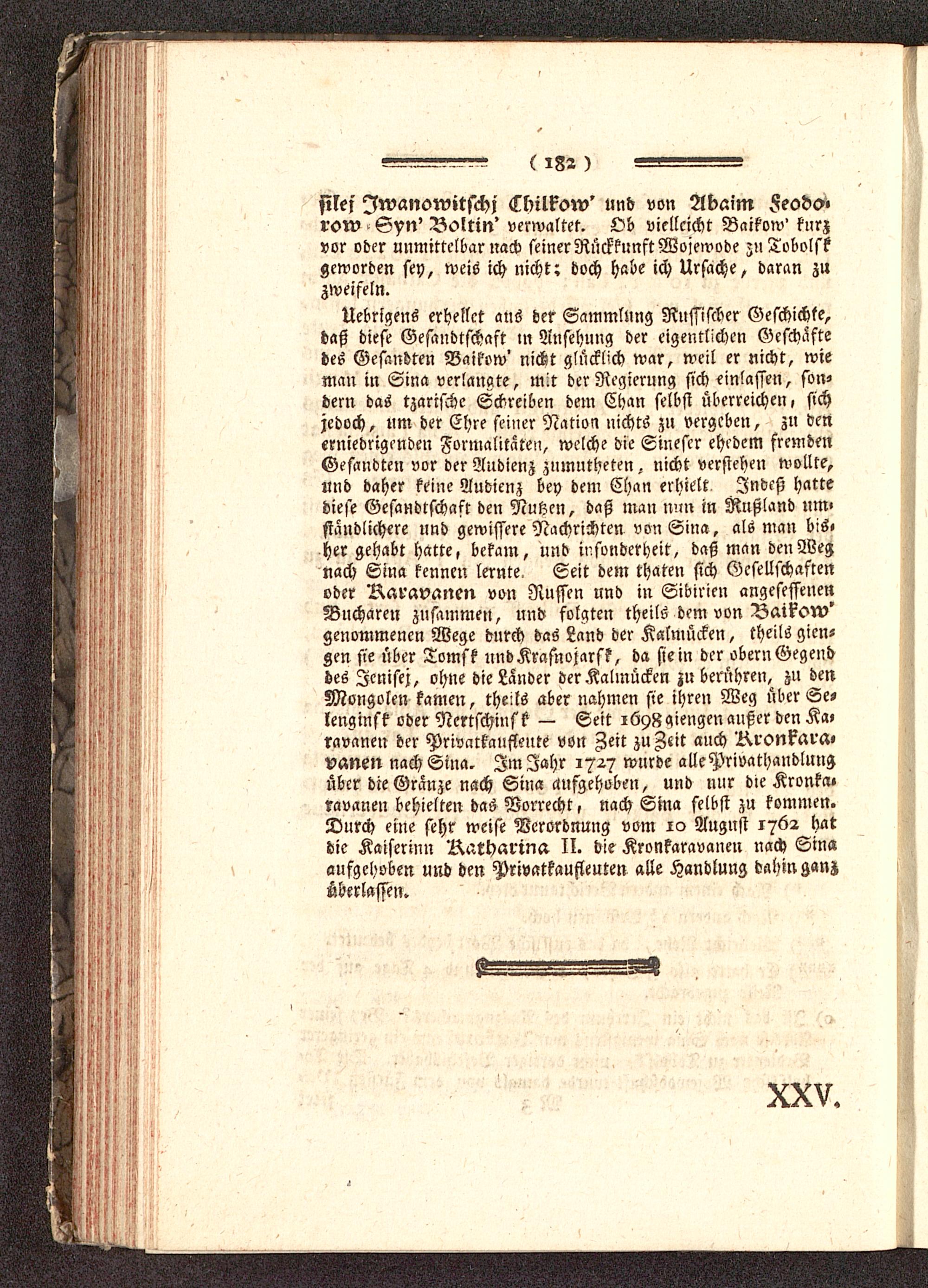 Uebrigens erhellet ans der Sammlung Russischer Geschichte,baß diese Gesandtschaft in Ansehung der eigentlichen Geschäftedes Gesandten Baikow' nickt glücklich war, weil er nicht, wieman in Sina verlangte, mit der Regierung sich einlassen, son-dern das tzarischc Schreiben dem Chan selbst überreichen, sichjedoch, um der Ehre seiner Nation nichts zu vergeben, zn denerniedrigenden Formalitäten, welch? die Sinescr ehedem fremdenGesandten vor der Audienz znmutheten, nicht verstehen wollte,und daher keine Audienz bey dem Chan erhielt Indeß hattediese Gesandtschaft den Nutzen, daß man nun in Rußland um«standlichcre und gewissere Nachrichten von Sina, als man bis»her gehabt hatte, bekam, und insonderheit, daß man den Wegnach Sina kennen lernte. Seit dem thaten sich Gesellschaftenoder Naravanen von Nüssen und in Sibirien angesessenenBncharen zusammen, und folgten theils dem von Baikon?'genommenen Wege durch das Land der Kalmücken, theils gicn-Zen sie über Tomsk undKrasnojarsk, da sie in der obern Gegenddes Jcnisej, ohne die Lander der Kalmücken zu berühren, zu denMongolen kamen, theils aber nahmen sie ihren Weg über Se-lenginsk oder Nertschinsk — Seit lüystqiengen außer den Ka»ravanen der Privarkaufleute von Zeit zu Zeit anch Aronkava«vanen nach Sina. Im Jahr 1727 wurde allePrivathaudluugüber die Gränze nach Sina cmfgehoben, und nur die Kronka«ravanen behielten das Vorrecht, nach Sina selbst zu kommen.Durch eine sehr weise Verordnung vom ic> August 1762 hatdie Kaiserinn Katharina II. die Kronkaravanen nach Sin«anfgchoben und den Privatkaufleuten alle Handlung dahin ganzüberlassen.