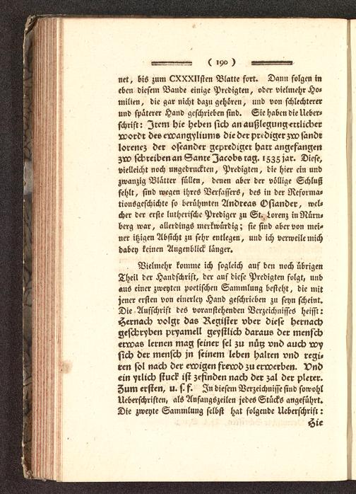 net, bis zum cxxxilsten Blatte fort. Dann folgen ineben diesem Bande einige Predigten, oder vielmehr Ho-milien, die gar nicht dazu gehören, und von schlechtererund spaterer Hand geschrieben sind. Sie haben die Ueber-schrift: Ircm hie heben sich anaußlegungerrlicderxvordr des eroang^liums die der Prediger zrv sandrlorencz der oscander geprediger harr angefangenzro schreibenan Ganre Jacobs rag. 1535 jar. Diese,vielleicht noch ungcdruckten, Predigten, die hier ein undzwanzig Blatter füllen, denen aber der völlige Schlußfehlt, sind wegen ihres Verfassers, des in der Reforma-tionsgefchichte so berühmten Andreas Dsiandcr, wel-cher der erste lutherische Prediger zu St., Lorenz in Nürn-berg war, allerdings merkwürdig; sie sind aber von mei-«ner itzigen Absicht zu sehr entlegen, und ich verweile michdabey keinen Augenblick langer.