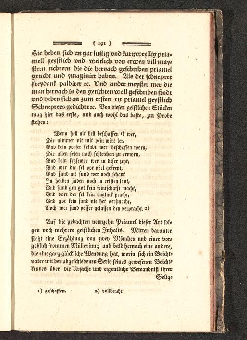 Auf die gebachten neunzehn Priamel dieser Art fol-gen noch mehrere geistlichen Inhalts. Mitten daruntersteht eine Erzählung von zwey Mönchen und einer vor-geblich frommen Müllerinn; und bald hernach eine andere,die eine ganz glückliche Wendung hat, worin sich ein BeichteVater mit der abgeschiedenkn Se^le seines gewesenen Beicht»kindes über die Ursache und eigentliche Bewandniß ihrer
