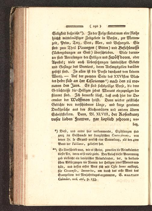 Seligkeit bespricht In der Folge findet man eine Reihehöchst mittelmäßiger Zeitgebete in Versen, znr Metten-zeit, Prim, Terz, Sert, Non, und Vesperzeit. Siesind zum Theil picungen (Bitten) und Befchlnusse(Uebergebungen an Gott ) überschrieben. Viele darun-ter sind Anrufungen der Heiligen und Zrvölfborcn, oderApostel; viele auch Übersetzungen lateinischer Gebeteund Gesänge des Breviers, deren Anfangszeilen darübergesetzt sind. In allen ist die Poesie durchaus von keinemWerth. — Auf der zweyten Seite des XXVIsten Blat,tes hcbr sich an der Lisioiattus^) nach den rii mo-naren des Iars. Es sind ftchszeilige Verse, die demGedächtnisse die Heiligen jedes Monats einzuprägen be-stimmt sind. Ich bemerke bloß, daß auch hier der De-cember der NOolffmon heisst. Dann wieder geistlicheGedichte von verschiedener lange, und kurze gereimteDenksprüche aus den Kirchenvätern und andern älternSchriftstellern. Dann, Bl. XI.VIII, der Rosenkranzvnftr lieben Zmrvcn, gar lieplich zehoren; wo-bey.