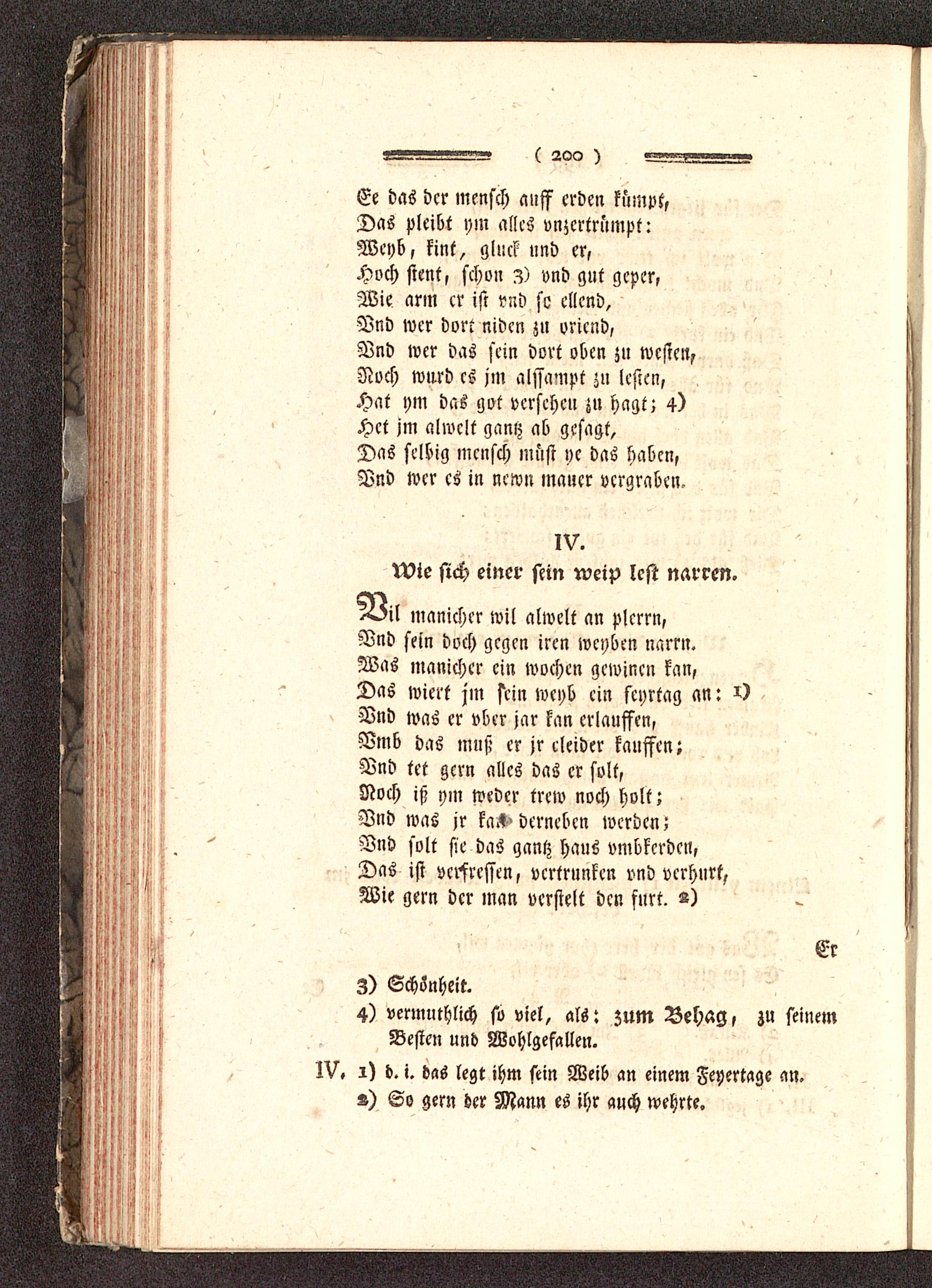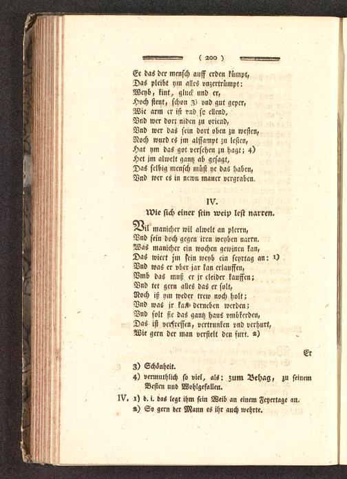 Äil manicher wil alwelt an plcrrn,Vnd sein doch gegen ircn wcybcn narrn.Was manicher ein Wochen gewincn kan,Das wiert jm fein weyb ein fcyrtag an: r)Vnd was er vber jar kan erlauffen,Vmb das muß cr jr cleider kanffcn;Vnd tct gern alles das cr svlt,Noch iß ym weder trew noch holt:Vnd was jr ka.<' dcrnebcn werden;Vnd solt sie das gantz Haus vmbkcrdcn,Das ist verfressen, vertrunken vnd verhütt,Wie gern der man verfielt den furt. «)