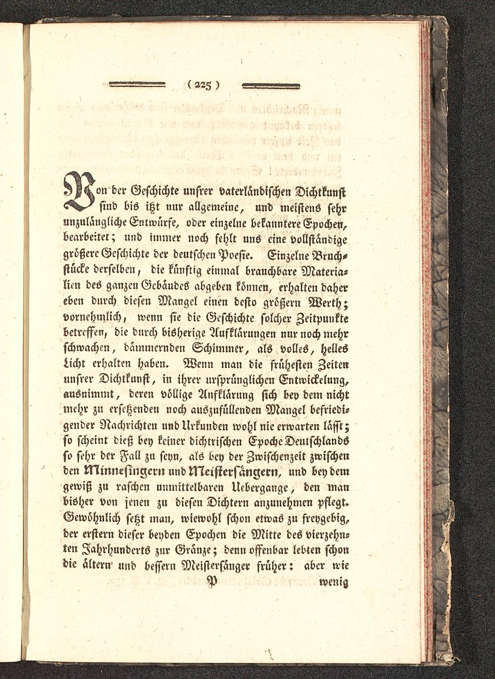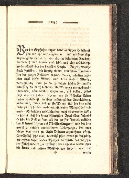 on der Geschichte unsrer vaterländischen Dichtkunstsind bis itzt nur allgemeine, und meistens sehrunzulängliche Entwürfe, oder einzelne bekanntere Epochen,bearbeitet; und immer noch fehlt uns eine vollständigegrößere Geschichte der deutschen Poesie. Einzelne Bruch-stücke derselben, die künftig einmal brauchbare Materia-lien des ganzen Gebäudes abgeben können, erhalten dahereben durch diesen Mangel einen desto größern Werth;vornehmlich, wenn sie die Geschichte solcher Zeitpunktebetreffen, die durch bisherige Aufklarungen nur noch mehrschwachen, dämmernden Schimmer, als volles, HellesLicht erhalten haben. Wenn man die frühesten Zeitenunsrer Dichtkunst, in ihrer ursprünglichen Entwickelung,ausnimmt, deren völlige Aufklärung sich bey dem nichtmehr zu ersetzenden noch auszufüllenden Mangel befriedi-gender Nachrichten und Urkunden wohl nie erwarten lässt;so scheint dieß bey keiner dichrrischen Epoche Deutschlands so sehr der Fall zu seyn, als bey der Zwischenzeit zwischenden Minnesingern und tNcistersangern, und bey demgewiß zu raschen unmittelbaren Uebergange, den manbisher von jenen zu diesen Dichtern anzunehmen pflegt.Gewöhnlich setzt man, wiewohl schon etwas zu freygebig,der erstern dieser beyden Epochen die Mitte des vierzehn-ten Jahrhunderts zur Gränze; denn offenbar lebten schondie ältern und bessern Meistersanger früher: aber wie