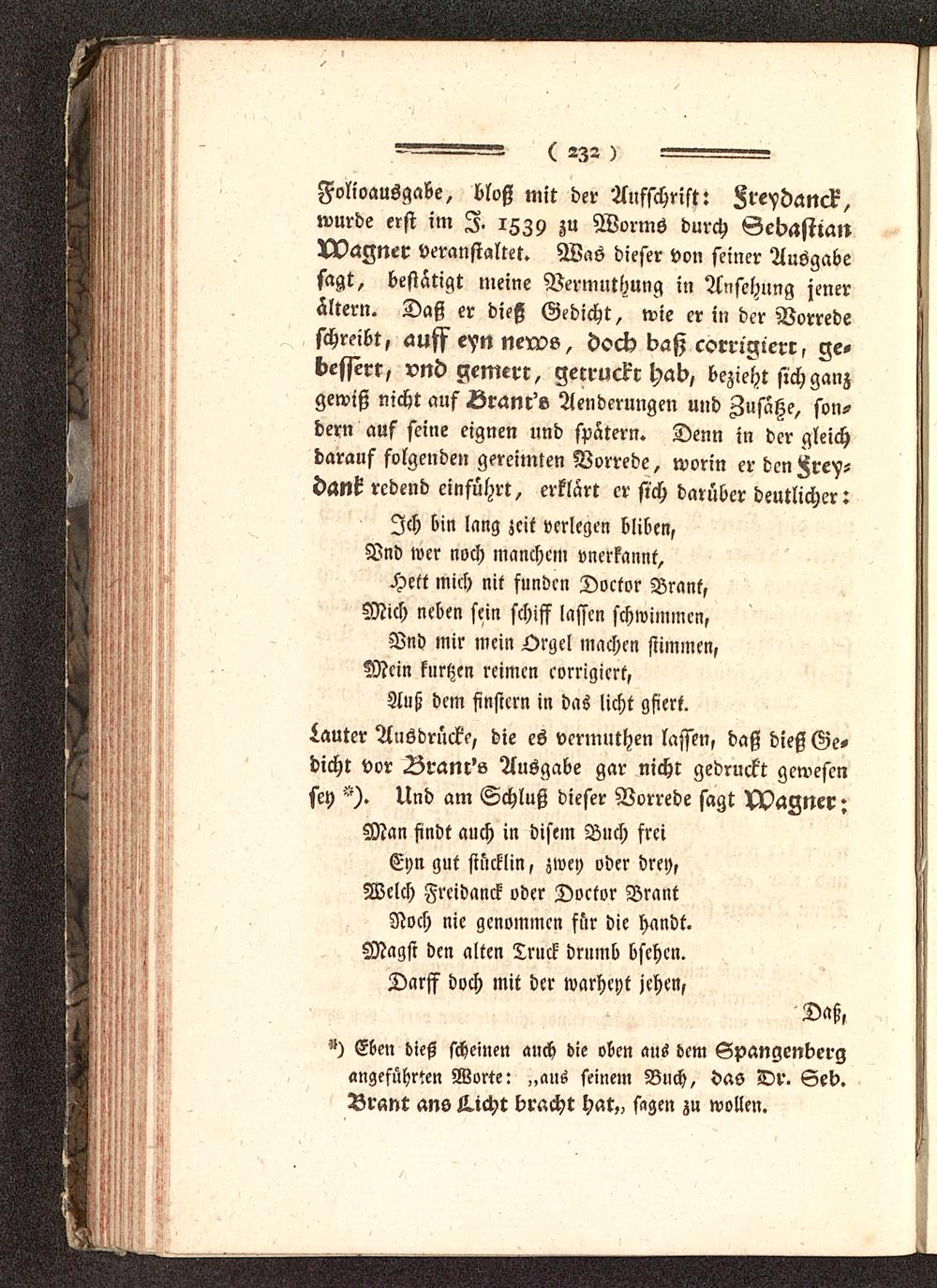 Folioausgabe, bloß mit der Aufschrift: A'eydanck,wurde erst im I. izzy zu Worms durch Gebastia»ZZlDagner Veranstaltet. Was dieser von seiner Ausgabesagt, bestätigt meine Vermuthung in Ansehung jenerältern. Daß er dieß Gedicht, wie er in der Vorredeschreibt, auff eyn nervs, docb baß corrtgierr, ge-bessert, vnd gcmerr, gerruckr hab, bezieht sich ganzgewiß nicht auf Lranr's Aenderungen und Zusätze, son-dern auf seine eignen und spätern. Denn in der gleichdarauf folgenden gereimten Vorrede, worin er dcn^rey-dant redend einführt, erklärt er sich darüber deutlicher:Ich bin lang zeit verlegen bliben,Vnd wer noch manchem vnerkannt,