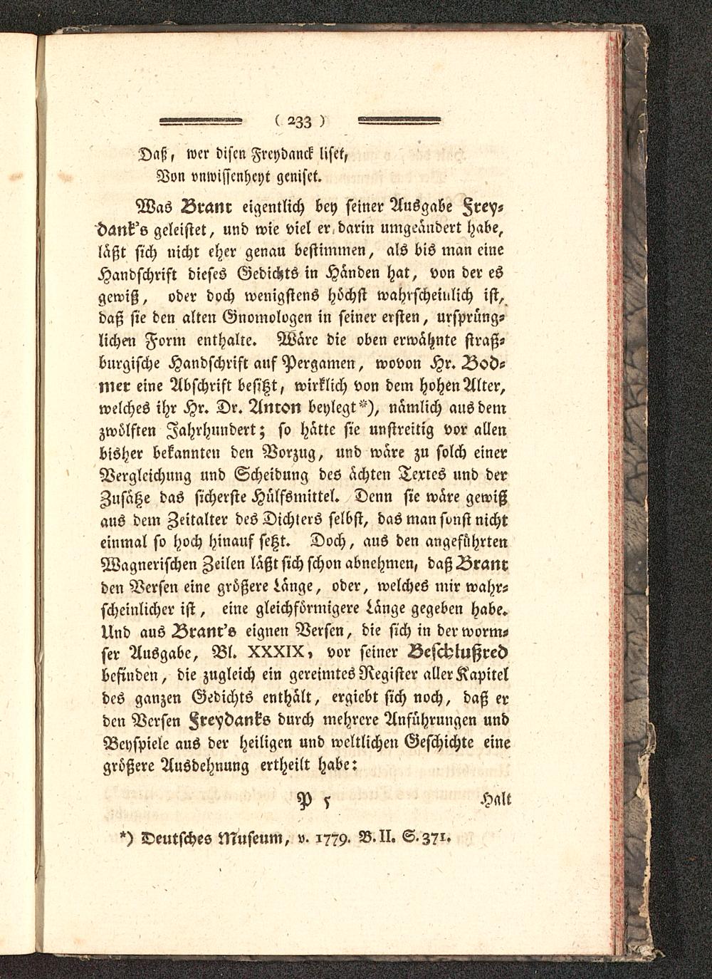 Was Branr eigentlich bey seiner Ausgabe Zrey-dan^s geleistet, und wie viel er darin umgeändert habe,läßt sich nicht eher genau bestimmen, als bis man eineHandschrift dieses Gedichts in Handen hat, von der esgewiß, oder doch wenigstens höchst wahrscheinlich ist,daß sie den alten Gnomolvgen in seiner ersten, ursprüng-lichen Form enthalte. Ware die oben erwähnte straß-burgische Handschrift auf Pergamen, wovon Hr. Bod-Mer eine Abschrift besitzt, wirklich von dem hohen Alter,welches ihr Hr. Dr. Anron beylegt^), nämlich aus demzwölften Jahrhundert; so hatte sie unstreitig vor allenbisher bekannten den Vorzug, und wäre zu solch einerVerglcichung und Scheidung des ächten Textes und derAnsäße das sicherste Hülfsmittel. Denn sie wäre gewißaus dem Zeitalter des Dichters selbst, das man sonst nichteinmal so hoch hinauf setzt. Doch, aus den angeführtenWagnerischen Zeilen läßt sich schon abnehmen, daß Branrden Versen eine größere Länge, oder, welches mir wahr-scheinlicher ist, eine gleichförmigere Länge gegeben habe.Und aus Branr's eignen Versen, die sich in der worm-ser Ausgabe, Bl. XXXIX, vor seiner Leschtußredbefinden, die zugleich ein gereimtes Register aller Kapiteldes ganzen Gedichts enthält, ergicbt sich noch, daß erden Versen Freibank» durch mehrere Anführungen undBeyspiele aus der heiligen und weltlichen Geschichte einegrößere Ausdehnung ertheilt habe: