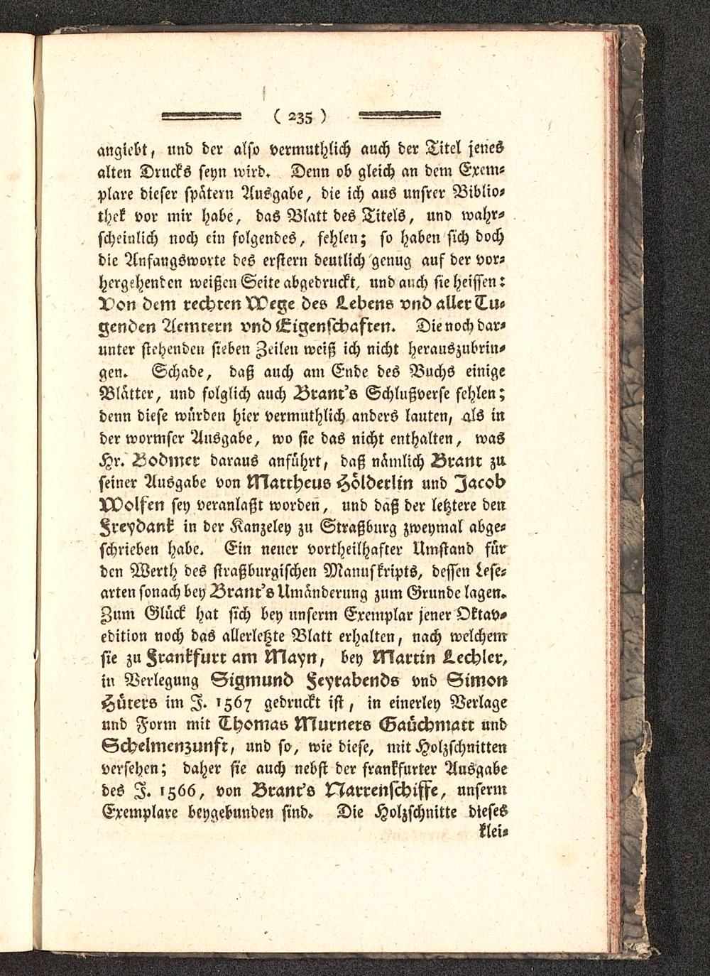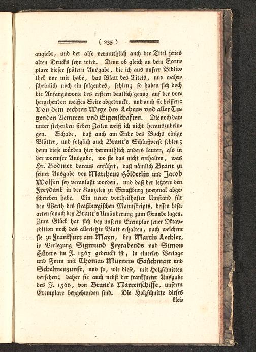 angiebt, und der also vermuthlich auch der Titel jenesalten Drucks seyn wird. Denn ob gleich an dem Exem-plare dieser spätern Ausgabe, die ich aus unsrer Biblio-thek vor mir habe, das Blatt des Titels, unv wahr-scheinlich noch ein folgendes, fehlen; so haben sich dochdie Anfangsrvorte des ersten, deutlich genug auf der vor-hergehenden weißen Seite abgedruckt, und auch sie heißen:!^'on dem rechten N)ege des L.ebens vnd aller Tu-genden Aemtern vnd iLictenscbafren. Die noch dar-unter stehenden sieben Zeilen weiß ich nicht herauszubrin-gen. Schade, daß auch am Ende des Buchs einigeBlätter, und folglich auch Bram's Schlußverfe fehlen;denn diese würden hier vermuthlich anders lauten, als inder wormscr Ausgabe, wo sie das nicht enthalten, wasHr. Lodmcr daraus anführt, daß nämlich Branr zu.seiner Ausgabe von Märchens Hölderlin und JacobWölfen sey veranlaßt worden, und daß der letztere denFre'sdant in der Kanzeley zu Straßburg zweymal abge-schrieben habe. Ein neuer vortheilhaster Umstand fürden Werth des straßburgischen Manuskripts, dessen Lese-arten sonach bey Äranr's Umänderung zum Grunde lagen.Zum Glück hat sich bey unserm Exemplar jener Oktav-edition noch das allerletzte Blatt erhalten, nach welchemsie zu Frankfurt am Mayn, bey Marrin Lechler,in Verlegung Sigmund Hcyrabends vnd SimonHürers im Z. 1567 gedruckt ist, in einerley Verlageund Form mit Thomas Murners Gaücbmarr undGchelmcnzunfr, und so, wie diese, mit Holzschnittenversehen; daher sie auch nebst der frankfurter Ausgabedes Z. 1566, von Vranr's Narrenschiffe, unsermExemplare beyqebunden sind» Die Holzschnitte dieses