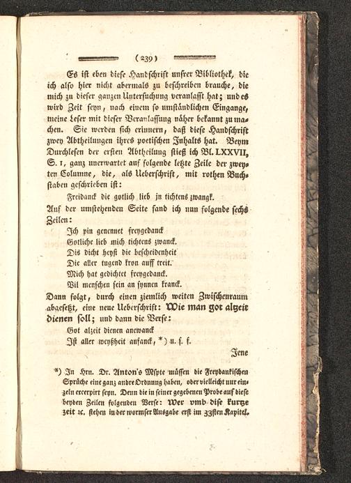 *) In Hrn. Dr. Anton's Mspte müssen die FreydankischenSprüche eine ganz andreOrdnung haben, oder vielleicht nur ein«zeln ercerpirt seyn. Denn die in seiner gegebenen Probe auf diesebeyden Zeilen folgenden Verft: Wer vmb dise kuryezeit :c. stehen in der wormftr Ausgabe erst im zzstenKapitet.