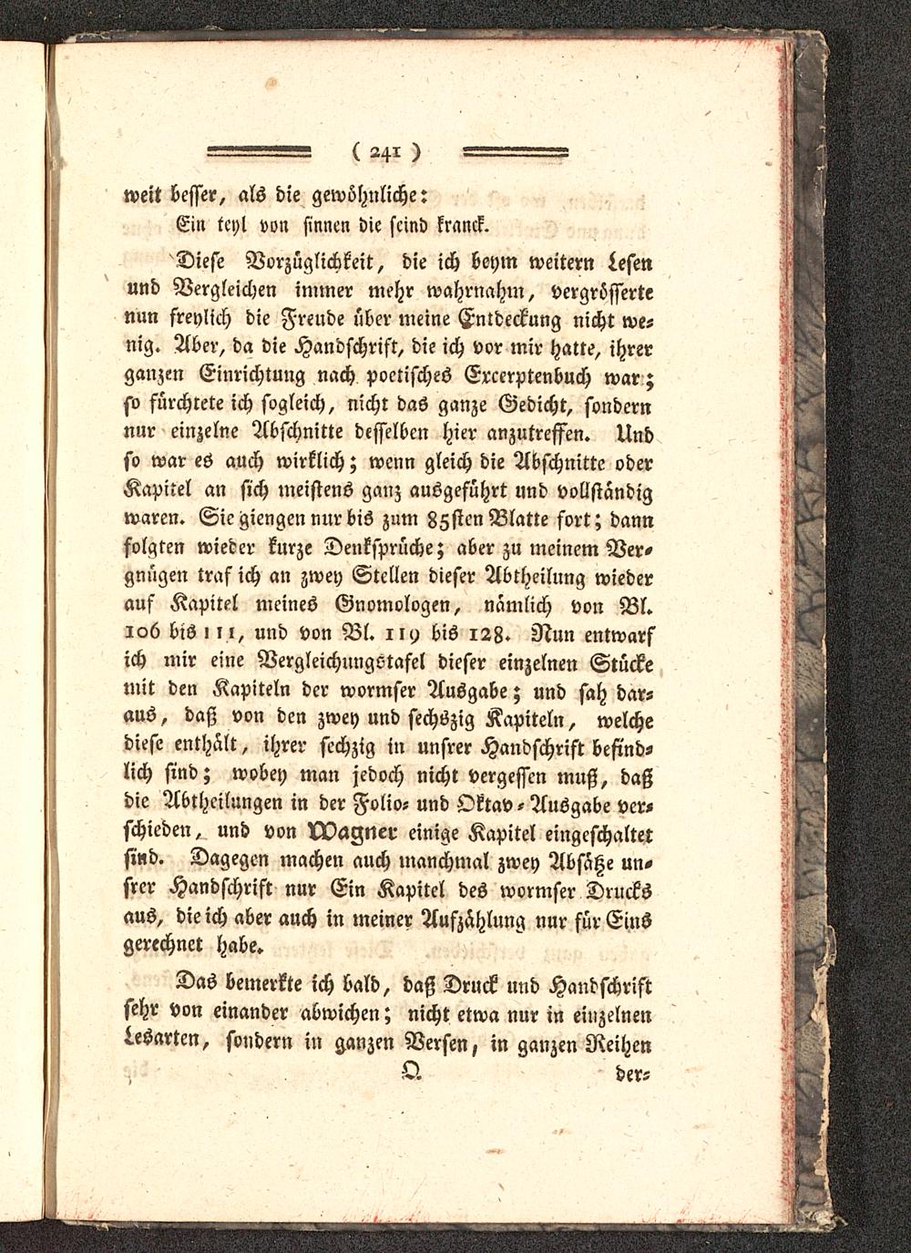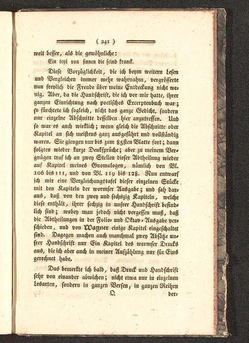 'Diese Vorzüglichkeit, die ich beym weitern Lesenund Vergleichen immer mehr wahrnahm, vergrößertenun freylich die Freude über meine Entdeckung nicht we-nig. Aber, da die Handschrist, die ich vor mir hatte, ihrerganzen Einrichtung nach poetisches Ercerptenbuch war;so fürchtete ich sogleich, nicht das ganze Gedicht, sondernnur einzelne Abschnitte desselben hier anzutreffen. Undso war es auch wirklich; wenn gleich die Abschnitte oderKapitel an sich meistens ganz ausgeführt und vollständigwaren. Sie gierigen nur bis zum Zzsten Blatte fort; dannfolgten wieder kurze Denksprüche; aber zu meinem Ver-gnügen traf ich an zwey Stellen dieser Abtheilung wiederauf Kapitel meines Gnomologen, nämlich von Bl.106 bis i i l, und von Bl. iil) bis 128. Nun entwarfich mir eine Vergleichungotafel dieser einzelnen Stückemit den Kapiteln der wormser Ausgabe; und sah dar-aus, daß von den zwey und sechszig Kapiteln, welchediefe enthält, ihrer sechzig in unsrer Handschrift befind-lich sind; wobey man jedoch nicht vergessen muß, daßdie Abtheilungen in der Folio- und Oktav - Ausgabe ver-schieden, und von Wagner einige Kapitel eingeschaltetsind. Dagegen machen auch manchmal zwey Absätze un-srer Handschrift nur Ein Kapitel des wormser Drucksaus, die ich aber auch in meiner Aufzählung nur für Einsgerechnet habe.