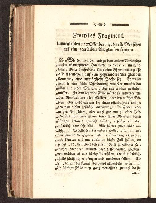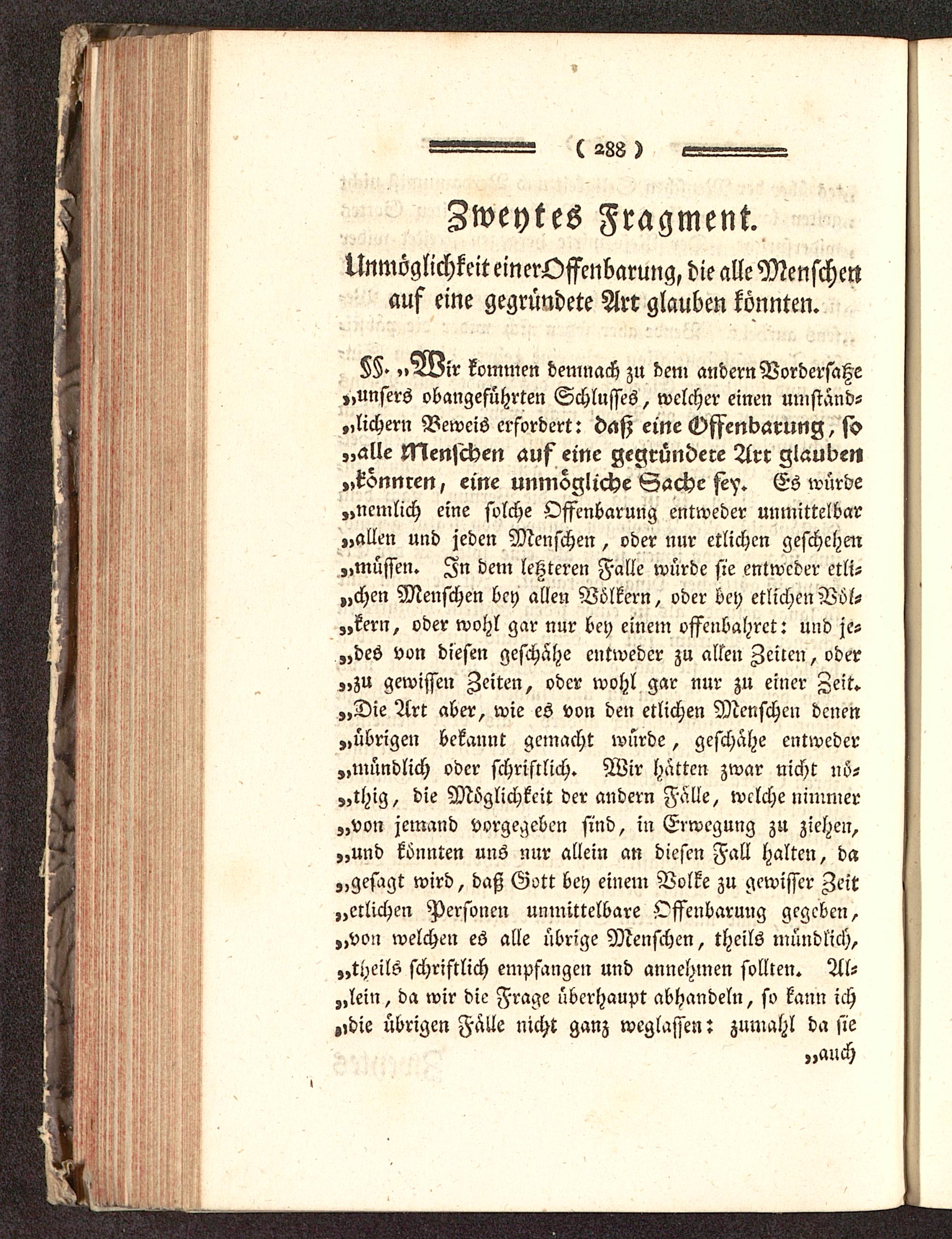 Zweytes Fragment. Unmöglichkeit eines Offenbarung, die alle Menschen auf eine gegründete Art glauben könnten