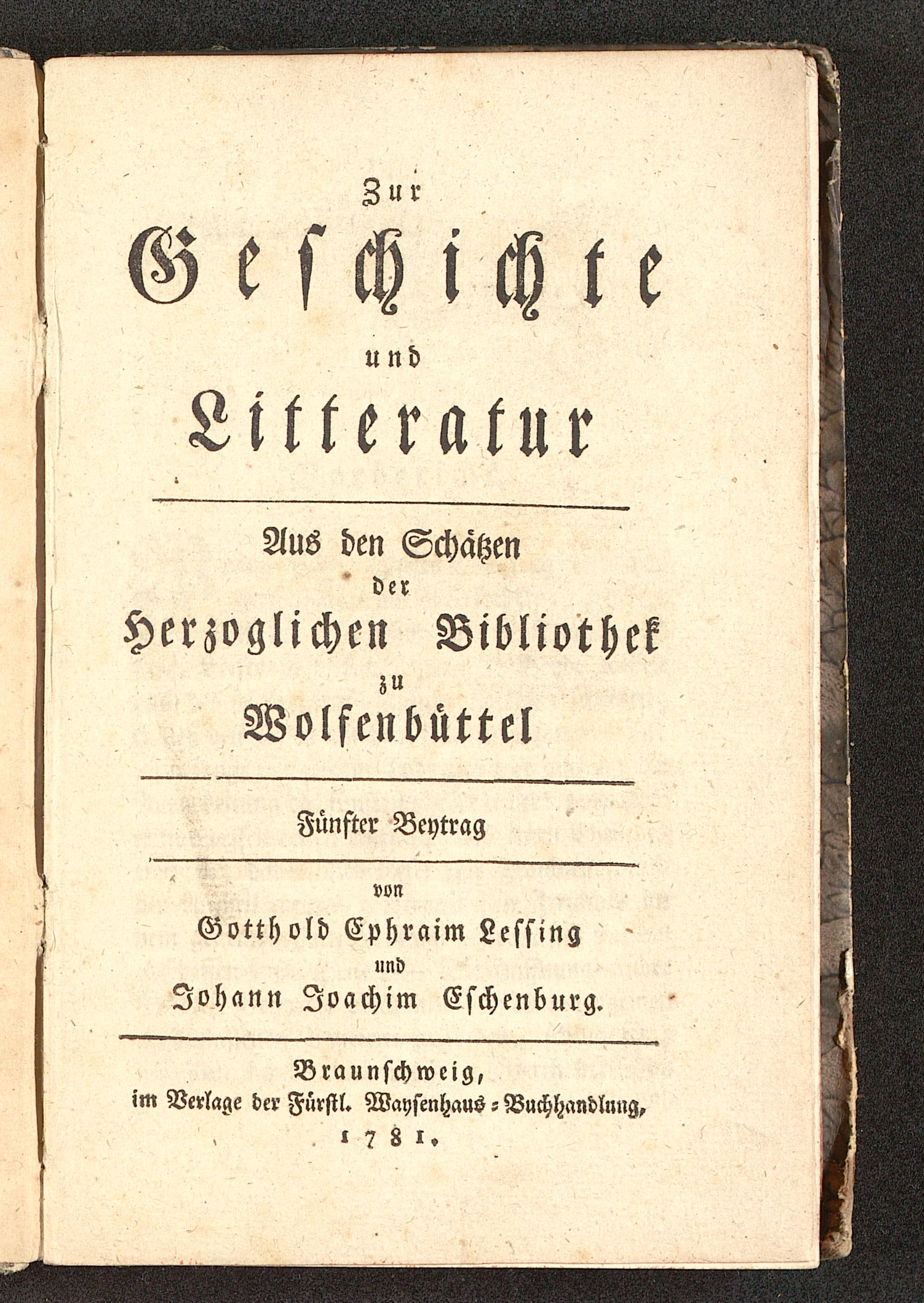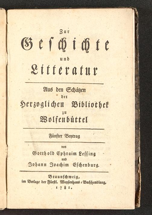 Zur Geschichte und Litteratur : aus den Schäzen der Herzoglichen Bibliothek zu Wolfenbüttel / von Gotthold Ephraim Lessing