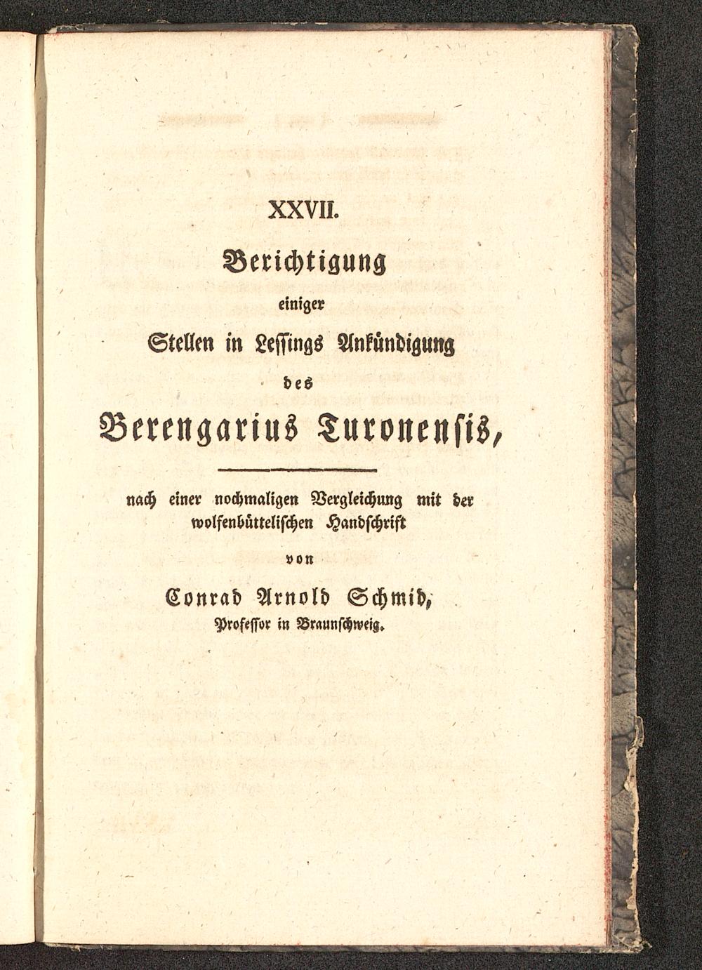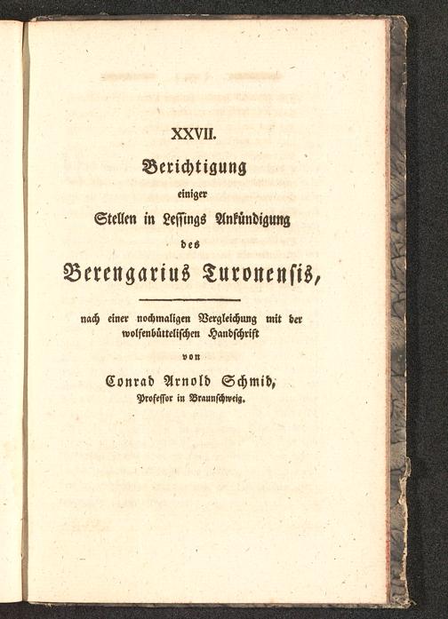 XXVII. Berichtigung einiger Stellen in Lessings Ankündigung des Berengarius Turonensis, nach einer nachmaligen Vergleichung mit der wolfenbüttelischen Handschrift von Conrad Arnold Schmid, Professor in Braunschweig